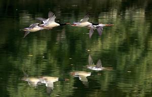 (251221) -- FUZHOU, 21 diciembre, 2025 (Xinhua) -- Imagen del 20 de diciembre de 2025 de serratas chinas volando sobre el río Dazhang, en el distrito de Yongtai, en la provincia de Fujian, en el sureste de China. Dieciséis serratas chinas, una especie protegida de primera clase a nivel nacional, fueron avistadas invernando aquí. (Xinhua/Wei Peiquan) (da) (ah)