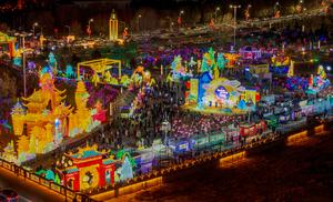 (251221) -- LIGA HINGGAN, 21 diciembre, 2025 (Xinhua) -- Vista aérea tomada con un dron el 20 de diciembre de 2025 de un festival de luces, en la bandera delantera del ala derecha de Horqin, en la Liga Hinggan, en la región autónoma de Mongolia Interior, en el norte de China. Un festival de luces comenzó aquí el sábado atrayendo a muchas personas a disfrutar de diversas instalaciones luminosas. (Xinhua) (ah) (da)
