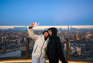(251221) -- TIANJIN, 21 diciembre, 2025 (Xinhua) -- Imagen del 20 de diciembre de 2025 de visitantes posando para una fotografía en la plataforma de observación Jinwan Yunding, en el distrito Heping de Tianjin, en el norte de China. Recientemente, la plataforma de observación Jinwan Yunding, situada en la plaza Jinwan, en el distrito Heping de Tianjin, ha comenzado a funcionar. Los visitantes pueden subir a la azotea, a 300 metros de altura, para contemplar la vista urbana de Tianjin. (Xinhua/Zhao Zishuo) (oa) (da)