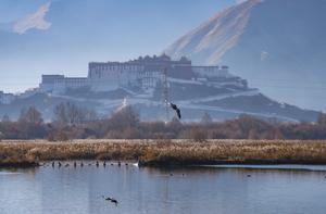 (251220) -- LHASA, 20 diciembre, 2025 (Xinhua) -- Gansos de cabeza barrada son vistos en la Reserva Natural Nacional del Humedal de Lhalu, con el Palacio de Potala al fondo, en Lhasa, en la región autónoma de Xizang, en el suroeste de China, el 20 de diciembre de 2025. Verificada por la Agencia de Certificación de Récords Mundiales (WRCA, por sus siglas en inglés), la Reserva Natural Nacional del Humedal de Lhalu ha sido confirmada como el "humedal natural urbano de mayor altitud". La ceremonia de certificación se llevó a cabo el sábado en el humedal. Ubicado en el área urbana de Lhasa, el humedal abarca una superficie de 12,2 kilómetros cuadrados a una altitud promedio de 3.649 metros. (Xinhua/Jigme Dorje) (jg) (da)