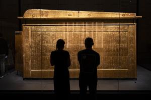 (251221) -- GIZA, 21 diciembre, 2025 (Xinhua) -- Imagen del 20 de diciembre de 2025 de personas observando un santuario de Tutankamón en la sala de exposiciones del rey Tutankamón del Gran Museo Egipcio, en Giza, Egipto. El Gran Museo Egipcio abrió sus puertas al público el 4 de noviembre, consolidándose como una de las mayores exposiciones de reliquias antiguas del mundo y una fortaleza de alta tecnología dedicada a la conservación del patrimonio. Las galerías principales exhiben por primera vez miles de antigüedades que antes estaban almacenadas, y albergan la colección completa de unos 5.992 artefactos de la tumba del niño rey Tutankamón. (Xinhua/Xin Mengchen) (oa) (ah)