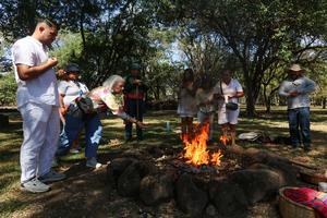 (251221) -- SAN SALVADOR, 21 diciembre, 2025 (Xinhua) -- Personas participan en una ceremonia maya por la celebración del Solsticio de Invierno en el parque arqueológico Cihuatán, en el departamento de San Salvador, El Salvador, el 21 de diciembre de 2025. (Xinhua/Alexander Peña) (ap) (oa) (da)