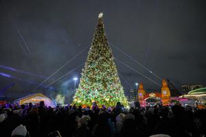 (251220) -- ASTANA, 20 diciembre, 2025 (Xinhua) -- Imagen del 19 de diciembre de 2025 de un árbol de Año Nuevo siendo encendido, en Astaná, Kazajistán. Una ceremonia de encendido del árbol de Año Nuevo se llevó a cabo el viernes en Astaná, con más de 40 grandes árboles de Año Nuevo iluminados por toda la ciudad. La ceremonia estuvo acompañada por un "festival de cuentos de hadas" en toda la ciudad, con conciertos, espectáculos de danza y fuegos artificiales. (Xinhua/Kalizhan Ospanov) (jg) (da)
