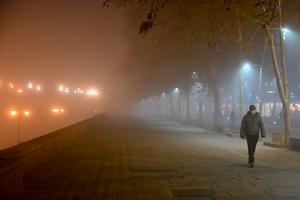 (251221) -- SKOPIE, 21 diciembre, 2025 (Xinhua) -- Imagen del 20 de diciembre de 2025 de un ciudadano caminando en una calle mientras niebla y contaminación cubren Skopie, Macedonia del Norte. Se han introducido medidas restrictivas en Strumica y Kicevo debido a los altísimos niveles de contaminación atmosférica. Desde el 19 de diciembre, también están en vigor en Skopie. (Xinhua/Tomislav Georgiev) (da) (ah)