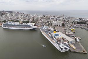 (251220) -- MONTEVIDEO, 20 diciembre, 2025 (Xinhua) -- Vista aérea tomada con un dron de cruceros atracados en el Puerto de Montevideo durante la temporada turística de cruceros 2025-2026, en Montevideo, capital de Uruguay, el 20 de diciembre de 2025. (Xinhua/Nicolás Celaya) (nc) (oa) (da)