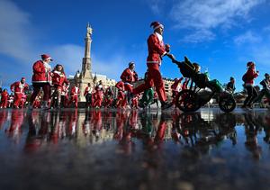 (251222) -- MADRID, 22 diciembre, 2025 (Xinhua) -- Imagen del 21 de diciembre de 2025 de corredores disfrazados como Santa Claus asistiendo a un evento de carreras con temática navideña, en Madrid, España. (Xinhua/Cheng Min) (ah) (oa) (vf)