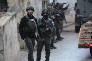 (251224) -- NAPLUSA, 24 diciembre, 2025 (Xinhua) -- Miembros de las fuerzas israelíes vigilan mientras una excavadora israelí demuele una vivienda, en el poblado de Bizzariya, en el noroeste de Naplusa, en Cisjordania, el 24 de diciembre de 2025. (Xinhua/Nidal Eshtayeh) (ah) (ra) (vf)