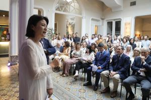 (251223) — MONTEVIDEO, 23 diciembre, 2025 (Xinhua) — Imagen del 22 de diciembre de 2025 de la pintora china residente en Uruguay y directora del Centro Nongyuan para América del Sur, Liu Meicen (frente), hablando durante la inauguración de la “Exposición de arte tradicional chino” llevada a cabo en la histórica Casona Mauá, en la Ciudad Vieja de Montevideo, capital de Uruguay. La tinta, el pincel y la caligrafía de la tradición china encuentran nuevos motivos y paisajes en Uruguay con la “Exposición de arte tradicional chino”, la cual reúne más de 40 obras de 18 artistas que posibilitan el diálogo entre ambas culturas. (Xinhua/Nicolás Celaya) (nc) (jg) (ra) (vf)