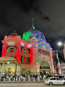 (251225) -- MELBOURNE, 25 diciembre, 2025 (Xinhua) -- Imagen tomada con un teléfono móvil de la Estación de Tren de Flinders iluminada con luces festivas para celebrar la Navidad, en Melbourne, Australia, el 25 de diciembre de 2025. (Xinhua/Xu Haijing) (jg) (ah) (vf)