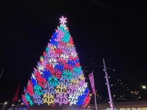 (251225) -- MELBOURNE, 25 diciembre, 2025 (Xinhua) -- Imagen tomada con un teléfono móvil de un árbol de Navidad adornado con luces festivas en la Plaza de la Federación, en Melbourne, Australia, el 25 de diciembre de 2025. (Xinhua/Xu Haijing) (jg) (ah) (vf)