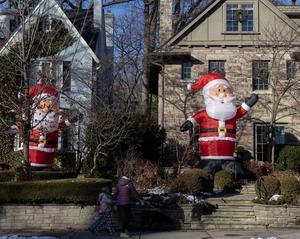 (251225) — TORONTO, 25 diciembre, 2025 (Xinhua) — Imagen del 24 de diciembre de 2025 de personas caminando frente a Santa Claus inflables de tamaño gigante en una calle, en Toronto, Canadá. (Xinhua/Zou Zheng) (da) (ra) (vf)