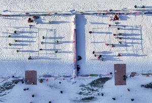 (251225) -- HARBIN, 25 diciembre, 2025 (Xinhua) -- Vista aérea tomada con un dron el 25 de diciembre de 2025 de personas jugando voleibol en el hielo en el Carnaval de Hielo y Nieve del Río Songhua de Harbin, en Harbin, en la provincia de Heilongjiang, en el noreste de China. El carnaval de hielo y nieve comenzó aquí el jueves. (Xinhua/Wang Song) (da) (ra) (vf)