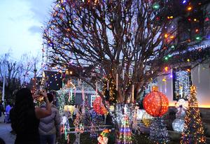 (251225) -- SAN FRANCISCO, 25 diciembre, 2025 (Xinhua) -- Imagen del 24 de diciembre de 2025 de personas observando decoraciones navideñas en Eucalyptus Avenue de San Carlos, en el Area de la Bahía de San Francisco de California, Estados Unidos. (Xinhua/Wu Xiaoling) (jg) (ah) (vf)