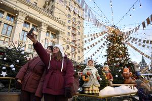 (251224) -- MOSCU, 24 diciembre, 2025 (Xinhua) -- Imagen del 23 de diciembre de 2025 de personas tomándose fotografías con decoraciones de Año Nuevo, en Moscú, Rusia. (Xinhua/Alexander Zemlianichenko Jr) (jg) (da) (vf)