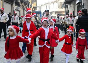 (251225) -- DAMASCO, 25 diciembre, 2025 (Xinhua) -- Imagen del 25 de diciembre de 2025 de niños sirios disfrazados como Santa Claus durante una celebración navideña, en Damasco, Siria. (Xinhua/Ammar Safarjalani) (da) (ra) (vf)