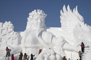 (251227) -- HARBIN, 27 diciembre, 2025 (Xinhua) -- Artesanos trabajan en una escultura de nieve en la 38 Exposición Internacional de Arte de Esculturas de Nieve de la Isla del Sol, en Harbin, en la provincia de Heilongjiang, en el noreste de China, el 27 de diciembre de 2025. La 38 Exposición Internacional de Arte de Esculturas de Nieve de la Isla del Sol se inauguró aquí para su prueba el sábado, con un área de exposición de 1,5 millones de metros cuadrados y un volumen de utilización de nieve de 120.000 metros cúbicos. (Xinhua/Zhang Tao) (oa) (da)
