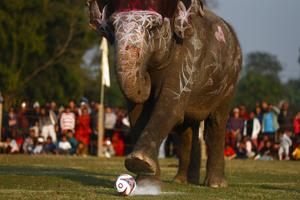 (251227) -- CHITWAN, 27 diciembre, 2025 (Xinhua) -- Imagen del 26 de diciembre de 2025 de un elefante lanzando un balón durante un partido de fútbol en el 19 Festival del Elefante y el Turismo, en Chitwan, Nepal. El evento tiene como objetivo acercar a los humanos a los elefantes, fomentar la protección y conservación de la vida silvestre y promover el turismo en la región. (Xinhua/Sulav Shrestha) (jg) (da)
