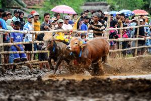 (251228) -- PROBOLINGGO, 28 diciembre, 2025 (Xinhua) -- Imagen del 27 de diciembre de 2025 de un hombre y sus toros participando en el Karapan Sapi Brujul, un evento tradicional de carreras de toros, en Probolinggo, Indonesia. (Xinhua/Sahlan Kurniawan) (ah) (da)