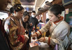 (260101) -- BEIJING, 1 enero, 2026 (Xinhua) -- Turistas compran sobres y postales conmemorativas en un tren temático que viaja de la Estación de Ferrocarril del Norte de Tianjin a la Estación de Ferrocarril de Beijing, el 1 de enero de 2026. El "Tianjin Fantasy Express" ha comenzado un servicio regular de ida y vuelta entre la Estación de Ferrocarril del Norte de Tianjin y la Estación de Ferrocarril de Beijing desde el jueves. La línea cuenta con 10 vagones con temáticas distintivas que combinan representaciones artísticas, presentaciones culturales y experiencias sobre el patrimonio cultural inmaterial. (Xinhua/Zhang Fan) (jg) (ah) (vf)