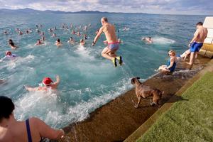 (260101) -- ZADAR, 1 enero, 2026 (Xinhua) -- Personas nadan en el mar Adriático como tradición para dar la bienvenida al Año Nuevo, en Zadar, Croacia, el 1 de enero de 2026. (Xinhua/Sime Zelic/PIXSELL) (jg) (ah) (vf)