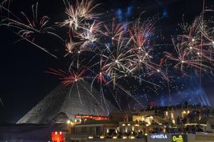 (260101) -- GIZA, 1 enero, 2026 (Xinhua) -- Fuegos artificiales explotan cerca de las Pirámides de Giza en celebración del Año Nuevo, en Giza, Egipto, el 1 de enero de 2026. (Xinhua/Xin Mengchen) (jg) (ah) (vf)