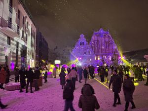 (260101) -- RIGA, 1 enero, 2026 (Xinhua) -- Imagen del 31 de diciembre de 2025 de personas celebrando el Año Nuevo en medio de la nieve, en la ciudad vieja de Riga, capital de Letonia. (Xinhua/Chen Yufen) (da) (ra) (vf)