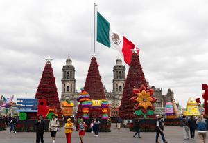 (251231) -- CIUDAD DE MEXICO, 31 diciembre, 2025 (Xinhua) -- Imagen del 30 de diciembre de 2025 de personas caminando frente a decoraciones de año nuevo en la plaza del Zócalo, en la Ciudad de México, capital de México. A medida que se acerca el año 2026, decoraciones festivas se ven en toda la Ciudad de México, llenando la ciudad con un fuerte ambiente de Año Nuevo. (Xinhua/Li Mengxin) (ah) (ra) (vf)