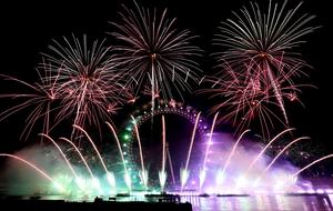 (260101) -- LONDRES, 1 enero, 2026 (Xinhua) -- Fuegos artificiales explotan frente al Ojo de Londres en celebración del Año Nuevo, en Londres, Reino Unido, el 1 de enero de 2026. (Xinhua/Li Ying) (da) (ra) (vf)
