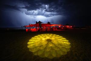 (260101) -- PUNTA DEL ESTE, 1 enero, 2026 (Xinhua) -- Personas se refugian de la lluvia durante una fiesta para dar la bienvenida al Año Nuevo en la playa en La Barra, en Punta del Este, Uruguay, el 1 de enero de 2026. (Xinhua/Nicolás Celaya) (nc) (jg) (ah) (vf)