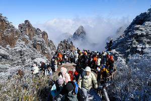(260102) -- BEIJING, 2 enero, 2026 (Xinhua) -- Turistas visitan el área escénica de la montaña Huangshan tras una nevada, en la ciudad de Huangshan, en la provincia de Anhui, en el este de China, el 2 de enero de 2026. Las nevadas azotaron muchas partes de China durante las vacaciones del Día de Año Nuevo, atrayendo a turistas para disfrutar del paisaje nevado. (Xinhua/Fan Chengzhu) (jg) (ra) (vf)