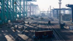 (260103) -- TIANJIN, 3 enero, 2026 (Xinhua) -- Imagen tomada con un dron el 3 de enero de 2026 de un robot de transporte inteligente (frente) moviendo un contenedor en una terminal de contenedores del Puerto de Tianjin, en Tianjin, en el norte de China. El Puerto de Tianjin ha sido testigo de una gran actividad durante estas vacaciones del día de Año Nuevo, con un flujo constante de buques atracando y descargando contenedores aquí, lo que marca un nuevo comienzo para el año nuevo. (Xinhua/Zhao Zishuo) (oa) (ra) (ce)