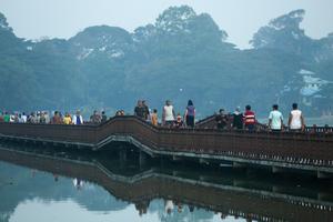(260103) -- YANGON, 3 enero de 2026 (Xinhua) -- Personas caminan por un puente de caballetes sobre el lago Kandawgyi a primera hora de la mañana, en Yangón, Myanmar, el 3 de enero de 2026. (Xinhua/Myo Kyaw Soe) (oa) (ra) (ce)