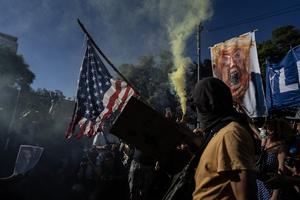 (260105) -- BUENOS AIRES, 5 enero, 2026 (Xinhua) -- Miembros de organizaciones sociales y políticas participan en una manifestación contra los ataques de Estados Unidos a Venezuela frente a la Embajada de Estados Unidos, en la ciudad de Buenos Aires, capital de Argentina, el 5 de enero de 2026. Organizaciones sociales, políticas y sindicales se movilizaron el lunes en Argentina para repudiar la agresión imperialista de Estados Unidos a Venezuela y en demanda de la liberación del presidente, Nicolás Maduro, y su esposa, Cilia Flores. (Xinhua/Martín Zabala) (mz) (ah) (oa) (vf)