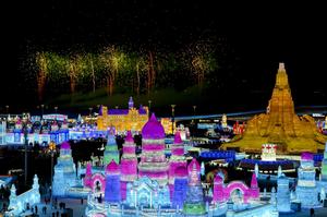 (260105) -- HARBIN, 5 enero, 2026 (Xinhua) -- Vista aérea tomada con un dron el 5 de enero de 2026 de un espectáculo de fuegos artificiales en el Mundo de Hielo y Nieve de Harbin, en Harbin, en la provincia de Heilongjiang, en el noreste de China. El 42 Festival Internacional de Hielo y Nieve de Harbin comenzó el lunes en el Mundo de Hielo y Nieve de Harbin. (Xinhua/Wang Song) (oa) (ah) (vf)