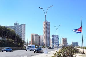 (260105) -- LA HABANA, 5 enero, 2026 (Xinhua) -- Automóviles circulan frente a una bandera nacional cubana a media asta, en La Habana, capital de Cuba, el 5 de enero de 2026. El presidente cubano, Miguel Díaz-Canel, decretó el domingo duelo nacional por el fallecimiento de 32 cooperantes militares cubanos en Venezuela, ocurrido durante los ataques perpetrados por Estados Unidos el 3 de enero. (Xinhua/Joaquín Hernández) (jh) (oa) (ah) (vf)