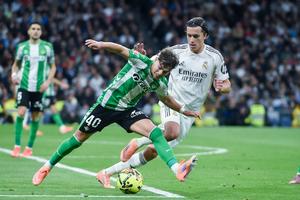 (260105) -- MADRID, 5 enero, 2026 (Xinhua) -- Imagen del 4 de enero de 2026 de Alvaro Carreras (d), de Real Madrid, disputando el balón con Angel Ortiz, de Real Betis, durante el partido de fútbol de La Liga entre Real Madrid y Real Betis en el Estadio Santiago Bernabéu, en Madrid, España. (Xinhua/Gustavo Valiente) (ah) (oa) (vf)
