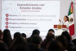 (260105) -- CIUDAD DE MEXICO, 5 enero, 2026 (Xinhua) -- La presidenta mexicana, Claudia Sheinbaum (d-atrás), habla durante su conferencia de prensa matutina, en Palacio Nacional, en la Ciudad de México, capital de México, el 5 de enero de 2026. El Gobierno de México condenó el lunes de manera categórica cualquier forma de intervención extranjera y reafirmó que la soberanía y la autodeterminación de los pueblos "no son opcionales ni negociables", tras los hechos ocurridos recientemente en Venezuela, donde una intervención directa de Estados Unidos derivó en la captura del presidente Nicolás Maduro y su esposa, así como en la pérdida de vidas humanas. (Xinhua/Francisco Cañedo) (fc) (ah) (oa) (vf)