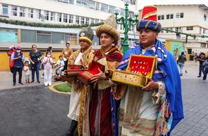 (260105) -- LIMA, 5 enero, 2026 (Xinhua) -- Integrantes de la Unidad Histórica de la Policía Montada-Potao, disfrazados de Los Reyes Magos, llegan al Instituto Nacional de Salud del Niño (INSN) de Perú, en Lima, Perú, el 5 de enero de 2026. Los Reyes Magos descendieron el lunes para traer alegría, ilusión y esperanza a niñas y niños que reciben atención médica o se encuentran internados en el INSN de Perú, en el marco de la tradicional Bajada de Reyes. (Xinhua/Mariana Bazo) (mb) (oa) (ah) (vf)