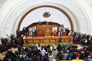 (260105) -- CARACAS, 5 enero, 2026 (Xinhua) -- Diputados de la Asamblea Nacional venezolana prestan juramento durante una sesión en el Palacio Federal Legislativo, en Caracas, Venezuela, el 5 de enero de 2026. El presidente de la Asamblea Nacional de Venezuela, Jorge Rodríguez, aseguró el lunes que utilizará todas las instancias y espacios disponibles para lograr el regreso del jefe de Estado, Nicolás Maduro, y de la primera dama, Cilia Flores, capturados el pasado sábado por fuerzas armadas estadounidenses. (Xinhua/Marcos Salgado) (ms) (oa) (ah) (vf)