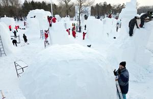 (260106) -- HARBIN, 6 enero, 2026 (Xinhua) -- Imagen tomada con un dron de concursantes trabajando en esculturas de nieve en el recinto de la Exposición Internacional de Arte de Esculturas de Nieve de la Isla del Sol, en Harbin, en la provincia de Heilongjiang, en el noreste de China, el 6 de enero de 2026. El 28 concurso internacional de esculturas de nieve de Harbin comenzó aquí el martes, atrayendo 25 equipos de escultores de nieve de 13 países. (Xinhua/Liu Yang) (jg) (ra) (vf)