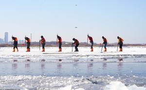(260106) -- HARBIN, 6 enero, 2026 (Xinhua) -- Imagen del 9 de diciembre de 2025 de trabajadores recogiendo hielo en la sección de Harbin del río Songhua, en Harbin, en la provincia de Heilongjiang, en el noreste de China. La "Ciudad de Hielo" de Harbin está experimentando una creciente afluencia de visitantes atraídos por los paisajes de hielo y nieve. El lunes se inauguró el 42 Festival de Hielo y Nieve en el Mundo de Hielo y Nieve de Harbin, el parque temático de hielo y nieve más grande del mundo y la atracción turística más emblemática de la ciudad. Durante las recientes vacaciones de Año Nuevo de tres días, Harbin recibió a más de 4,1 millones de viajeros. (Xinhua/Wang Song) (oa) (ah)