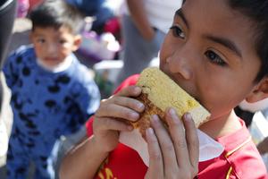 (260106) -- CIUDAD DE MEXICO, 6 enero, 2026 (Xinhua) -- Imagen del 5 de enero de 2026 de un niño disfrutando de una rebanada de la tradicional Rosca de Reyes, en la Ciudad de México, capital de México. Personas se reunieron el lunes en el monumento del Angel de la Independencia para disfrutar de la tradicional Rosca de Reyes, como parte de las celebraciones previas al Día de Reyes el 6 de enero. (Xinhua/Francisco Cañedo) (oa) (ah) (vf)