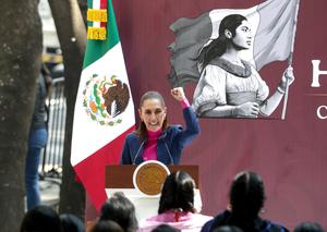 (260107) -- CIUDAD DE MEXICO, 7 enero, 2026 (Xinhua) -- La presidenta mexicana, Claudia Sheinbaum, habla durante el evento de develación de seis esculturas de mujeres ancestras en el Paseo de las Heroínas, en la Ciudad de México, capital de México, el 7 de enero de 2026. (Xinhua/Francisco Cañedo) (fc) (jg) (ra) (vf)