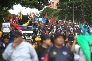 (260108) -- CARACAS, 8 enero, 2026 (Xinhua) -- Imagen del 8 de enero de 2026 de personas participando en una movilización para exigir la liberación del presidente venezolano, Nicolás Maduro y de la primera dama, Cilia Flores, capturados por Estados Unido, en Caracas, Venezuela. La presidenta encargada de Venezuela, Delcy Rodríguez, informó el jueves el inicio de una agenda de trabajo gubernamental centrada en la atención y recuperación de las zonas afectadas por el ataque de Estados Unidos del pasado 3 de enero. (Xinhua/Marcos Salgado) (ms) (ah) (vf)