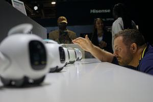 (260109) -- LAS VEGAS, 9 enero, 2026 (Xinhua) -- Imagen del 7 de enero de 2026 de un visitante observando los robots de compañía Beta en el área de exposición de Hisense durante la Feria de Electrónica de Consumo (CES, por sus siglas en inglés) 2026, en Las Vegas, Estados Unidos. La CES 2026, el evento tecnológico más importante del mundo, se celebra aquí del martes al viernes. La feria anual ha atraído a miles de expositores de más de 155 países y regiones, de acuerdo con la Asociación de Tecnología de Consumo de Estados Unidos, la organizadora. (Xinhua/Zeng Hui) (jg) (ra) (vf)