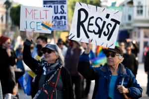 (260111) -- SAN FRANCISCO, 11 enero, 2026 (Xinhua) -- Imagen del 10 de enero de 2026 de personas asistiendo a una protesta, en San Francisco, California, Estados Unidos. Personas se reunieron aquí para protestar en contra del ataque de Estados Unidos a Venezuela, así como por la muerte a tiros de una mujer de 37 años por parte de un agente del Servicio de Inmigración y Control de Aduanas en Minnesota el 7 de enero. (Xinhua/Ziyu Julian Zhu) (oa) (ah) (ce)