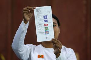 (260111) -- YANGON, 11 enero, 2026 (Xinhua) -- Una funcionaria de la Comisión Electoral de la Unión muestra una papeleta para el conteo durante la segunda fase de las elecciones generales, en una estación de votación, en Yangón, Myanmar, el 11 de enero de 2026. La votación para la segunda fase de las elecciones generales democráticas multipartidistas de Myanmar concluyó el domingo por la tarde. (Xinhua/Myo Kyaw Soe) (oa) (ah)