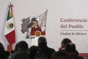 (260112) -- CIUDAD DE MEXICO, 12 enero, 2026 (Xinhua) -- La presidenta mexicana, Claudia Sheinbaum, habla durante su conferencia de prensa matutina, en Palacio Nacional, en la Ciudad de México, capital de México, el 12 de enero de 2026. Sheinbaum sostuvo una conversación telefónica el lunes con el presidente de Estados Unidos, Donald Trump, durante la cual ella descartó cualquier intervención militar estadounidense en territorio mexicano. (Xinhua/Francisco Cañedo) (fc) (ah) (oa)