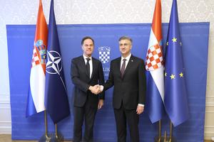 (260113) -- ZAGREB, 13 enero, 2026 (Xinhua) -- Imagen del 12 de enero de 2026 del primer ministro croata, Andrej Plenkovic (d), reuniéndose con el visitante secretario general de la Organización del Tratado del Atlántico Norte (OTAN), Mark Rutte, en Zagreb, Croacia. No se enviarán tropas croatas a Ucrania, reiteró Plenkovic en una conferencia de prensa conjunta con Rutte el lunes. (Xinhua/Patrik Macek/PIXSELL) (jg) (ra) (vf)