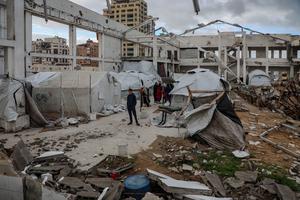 (260113) -- GAZA, 13 enero, 2026 (Xinhua) -- Palestinos inspeccionan un edificio colapsado debido a la tormenta, en la Ciudad de Gaza, el 13 de enero de 2026. Cuatro palestinos murieron en la Ciudad de Gaza en dos incidentes separados, mientras las fuertes lluvias y vientos azotaban la región el martes. (Xinhua/Rizek Abdeljawad) (jg) (ra) (vf)